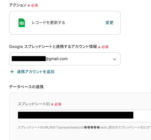 アクションは変更せず、アカウント情報がマイアプリ連携をしたアカウントと一致することを確認したら、データベースの連携を設定していきます。