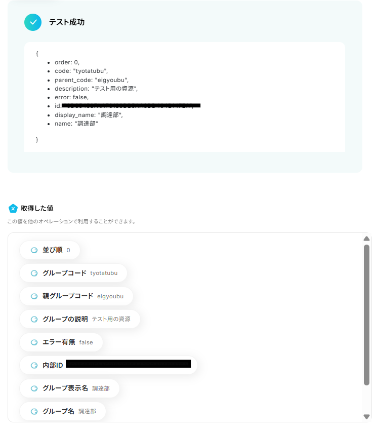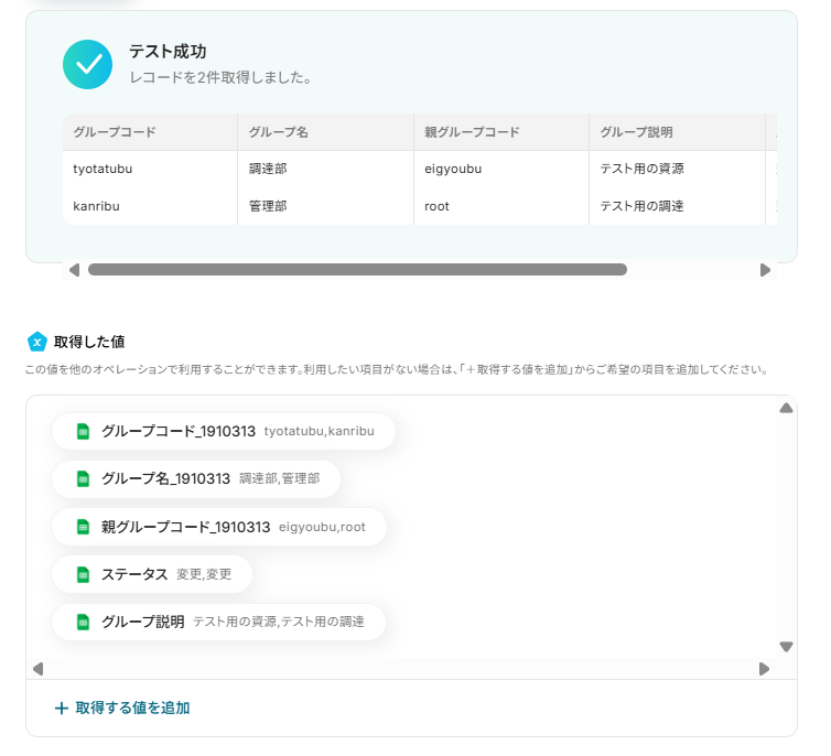 テストに成功すると、取得した値にGoogle スプレッドシートで取得した情報が追加されます。