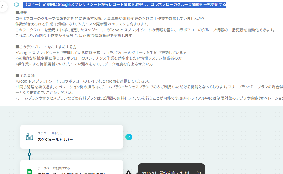 それではここから代表的な例として、定期的にGoogleスプレッドシートの情報を基に、コラボフローのグループ情報を一括で更新するフローを解説していきます!
