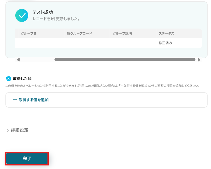 「テスト」をクリックし、取得した値の内容が確認できたら、「完了」をクリックします。