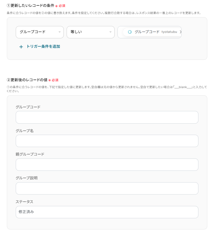 更新したいレコードは先ほどまで「修正」だったステータスを「修正済み」に変更したいので、以下のように設定しました。