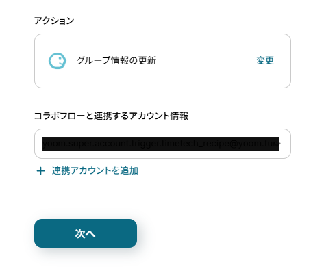 アクションは変更せず、アカウント情報がマイアプリ連携をしたアカウントと一致することを確認したら、「次へ」をクリックします。