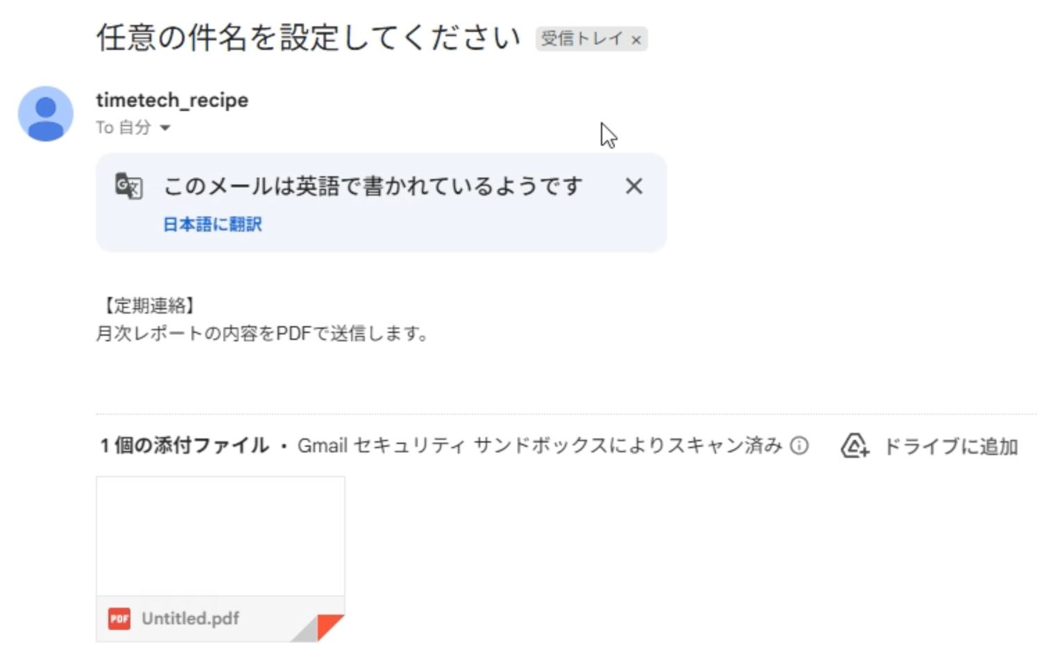 実際に指定スケジュールになったタイミングで、メールにファイルが正しく添付されて届くかを確認してみましょう。