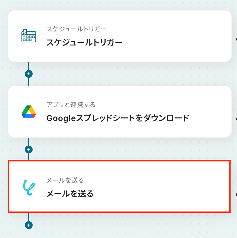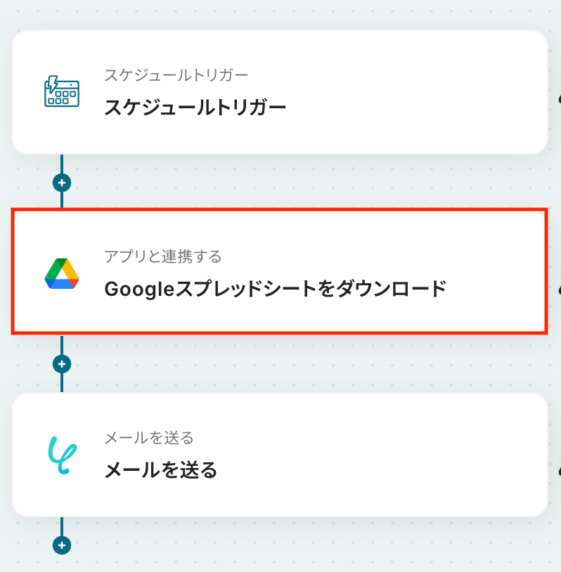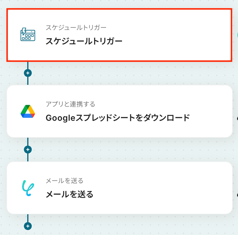 スケジュールトリガー機能では、実行したい日時を「毎日9時」や「毎週月曜日」など、業務に合わせて自由に設定してください Google Driveのアクションでは、ダウンロード対象となるファイルのIDや、ダウンロードする際のファイルタイプ(PDF、Excelなど)を任意で指定できます メール機能では、送信先のメールアドレス、件名、本文を自由に設定することができます ■注意事項