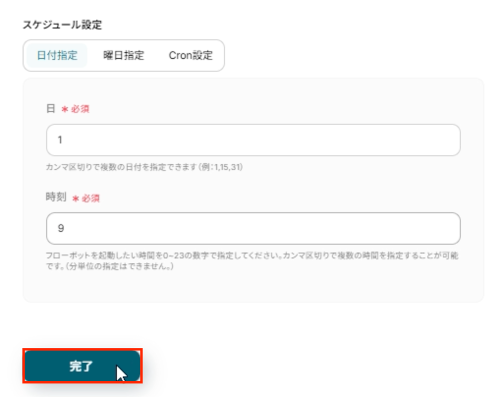 今回は毎月1日の朝9時にフローボットを実行するよう、以下のスケジュールを設定しています。