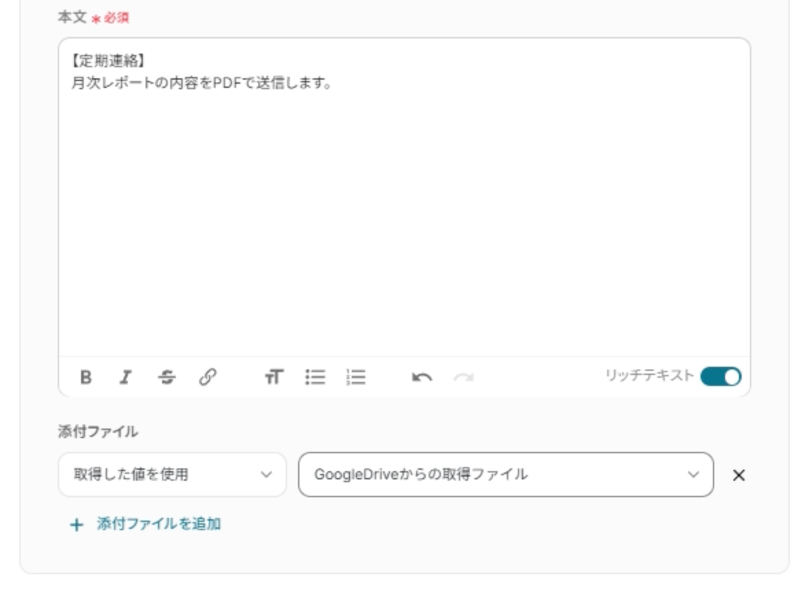 添付ファイル 前のステップでGoogle Driveから取得したファイルがデフォルトで設定されているので、確認しましょう。