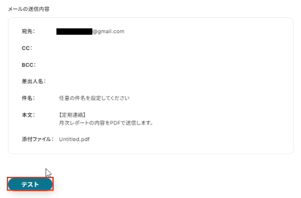 送信先・件名・本文・添付ファイルなどが正しく設定されているか確認できたら「テスト」をクリックして、実際に指定した内容でメールが届くかを確認してください。