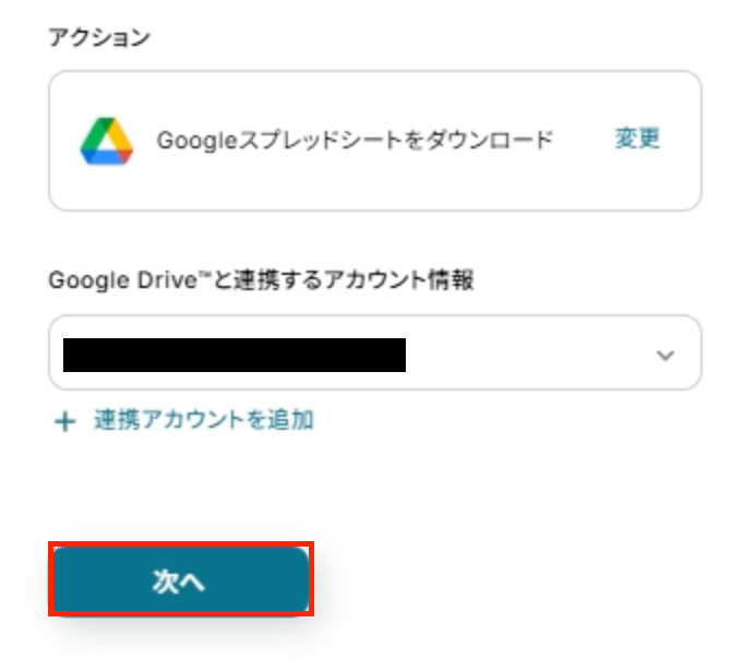 アクションはあらかじめ設定されているため、そのまま内容を確認してください。 Google Driveと連携するアカウント情報に問題がなければ、「次へ」をクリックします。