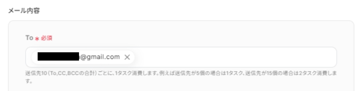 送信先として必要な宛先を入力してください。 ※なお、この後のフローで連携テストを行うと、ここで設定した宛先に実際にメールが送信されます。