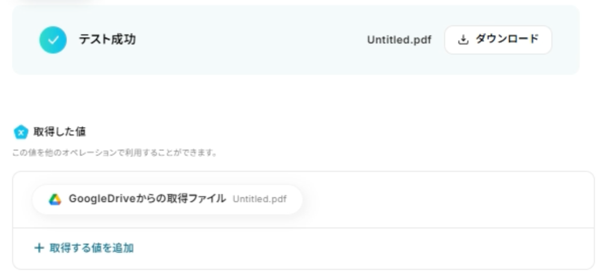 テストに成功すると、Google DriveからダウンロードされたPDFファイルが表示されます。 以下の取得した値はこの後のステップで利用できます。