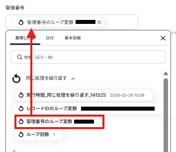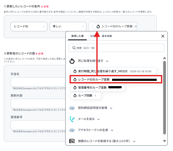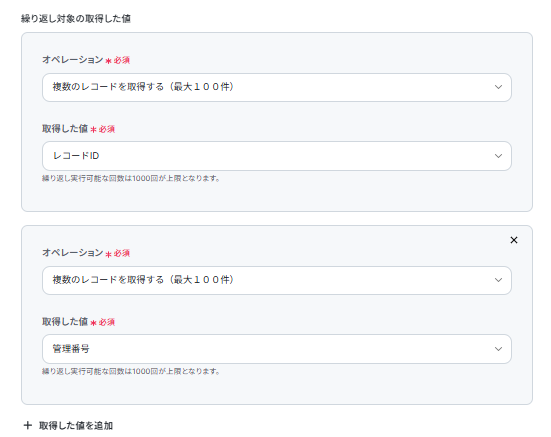 オペレーションと取得した値を設定します。 ここでは、レコードID、管理番号を繰り返し取得するように設定しています。 設定内容の確認ができたら、「完了」をクリックします。