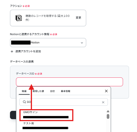 アクションは変更せず、アカウント情報がマイアプリ連携をしたアカウントと一致することを確認してください。 データベースIDはボックスから事前に準備していたデータベースを選択し、「次へ」をクリックします。