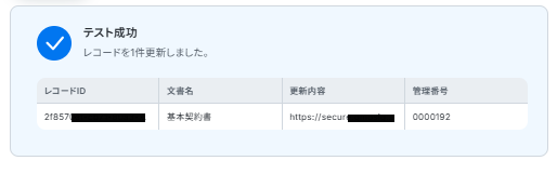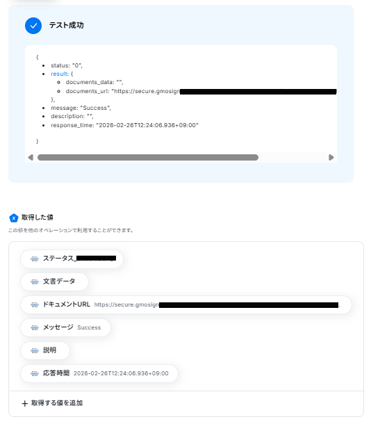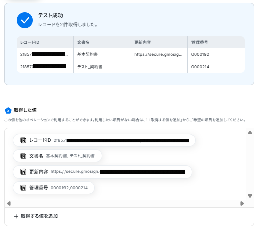 入力が完了したら、「テスト」をクリックします。 テストに成功すると、「取得した値」に情報が追加されます。 ※取得した値とは 設定時の「テスト」で取得した値のことです。後続ステップの入力値として利用でき、実行のたびに最新の内容に更新(変動)されます。