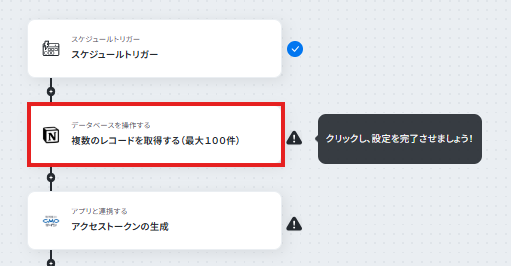 フローに戻り、「複数のレコードを取得する(最大100件)」をクリックします。