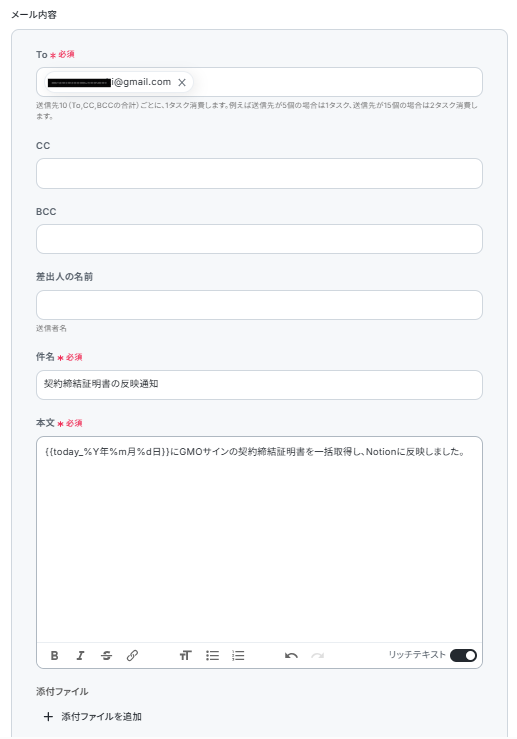 Googleドキュメントの「書類を発行する」アクションでは、あらかじめ用意した雛形を使用することで、任意のレイアウトで契約書を作成できます。 GMOサインの「封筒用文書の登録」では、書類名などに固定のテキストを設定したり、スプレッドシートから取得した情報を動的な値として設定することが可能です。 GMOサインの「封筒への署名依頼」では、署名者の氏名やメールアドレスなどをスプレッドシートのデータと連携させ、動的に設定することができます。 ■注意事項