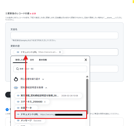 更新後のレコードの値は「更新内容」だけ変更したいので、以下のように設定しています。