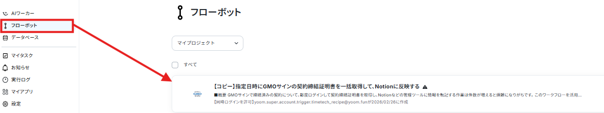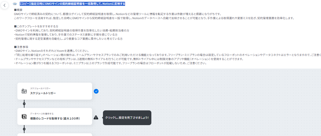 GMOサインの契約締結証明書をNotionに自動で保管するフローを作ってみよう それではここから代表的な例として、指定した日時にGMOサインから契約締結証明書を一括で取得し、Notionに自動で反映するフローを解説していきます!