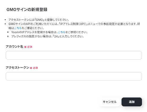 GMOサインを選択したら、アカウント名とアクセストークンを入力し、「追加」をクリックします。