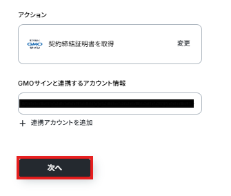 アクションは変更せず、アカウント情報がマイアプリ連携をしたアカウントと一致することを確認したら、「次へ」をクリック。