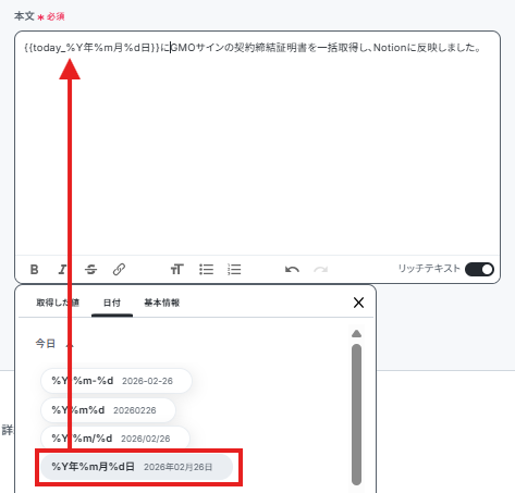 本文は取得した値や日付を引用して作成できます。 必要に応じてカスタマイズしてください。
