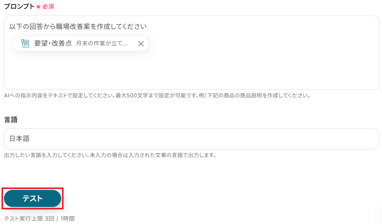 プロンプトは予め設定されている通りで大丈夫なので、任意で言語を入力してテストしてください。