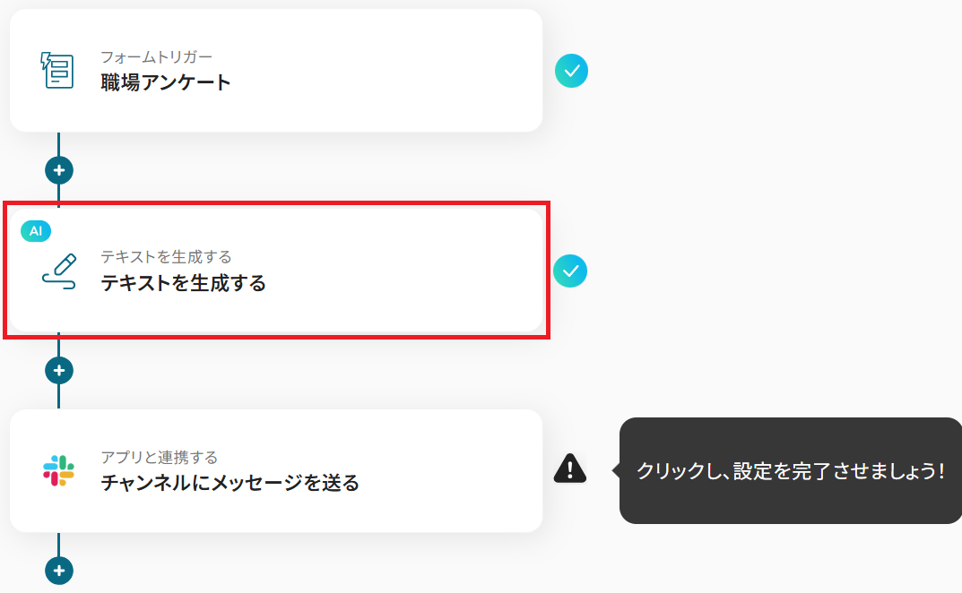 - フォームのトリガー設定、AIオペレーション設定、Slackのアクション設定