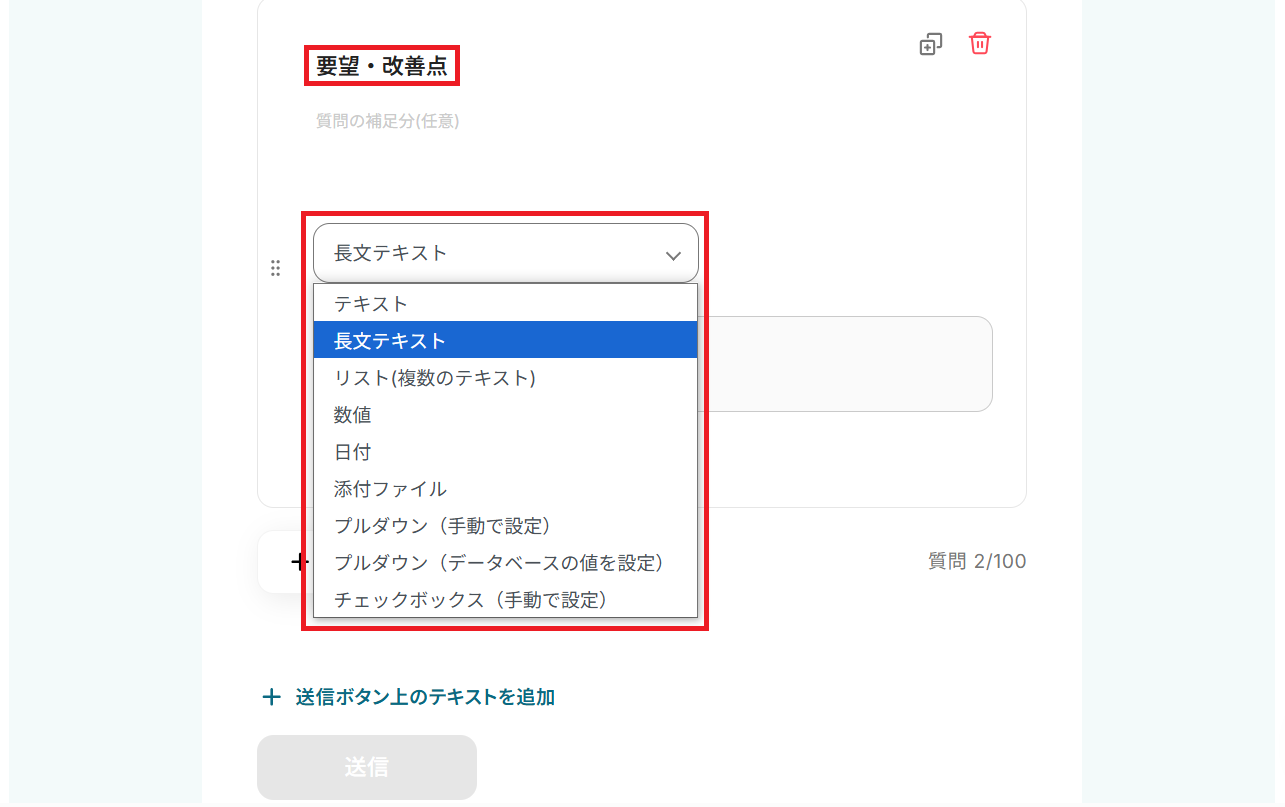 まずフォームを作成します。今回はテンプレートを使っているため質問事項が予め設定されていますが、編集・追加する場合は項目名を入力し回答方法をプルダウンから選択しましょう。