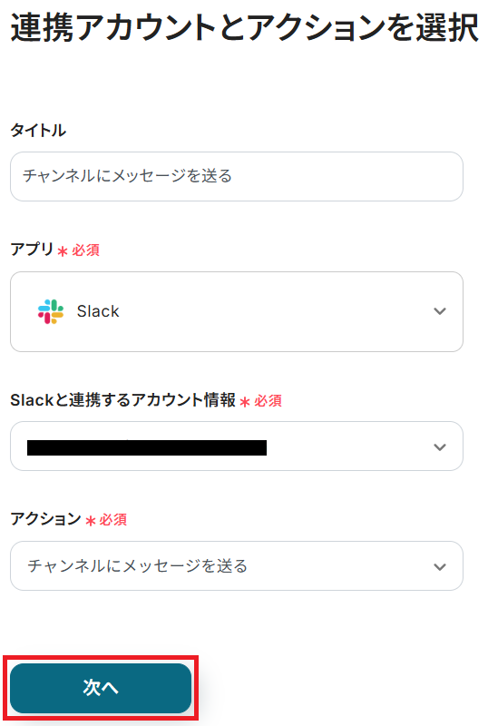 ステップ3・4と同様、アクションは「チャンネルにメッセージを送る」のまま「次へ」をクリックしてください。