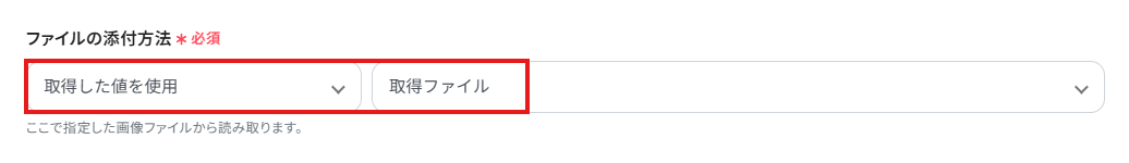「ファイルの添付方法」は、プルダウンから取得した値を選択してください。