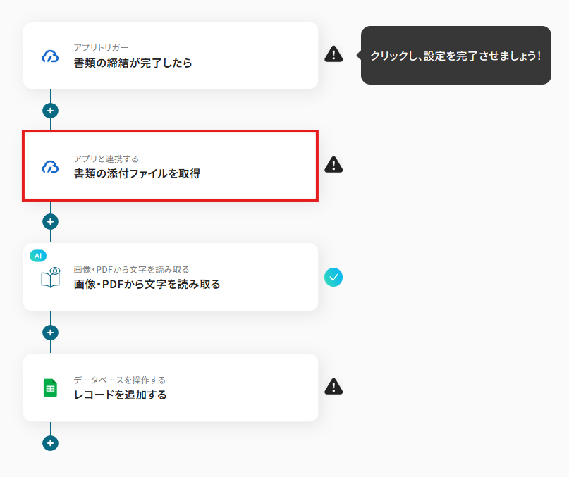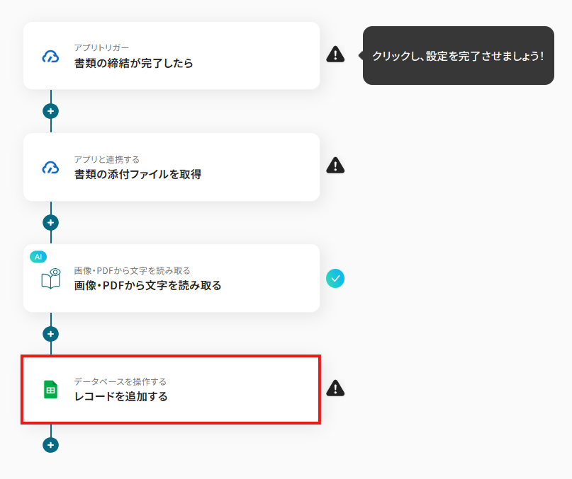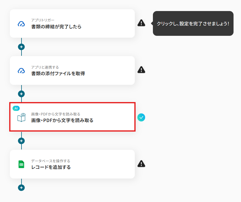 それではここから代表的な例として、クラウドサインで書類の締結が完了したら、AI OCRで契約書の内容を読み取り、指定した情報をGoogle スプレッドシートに自動で記録するフローを解説していきます!