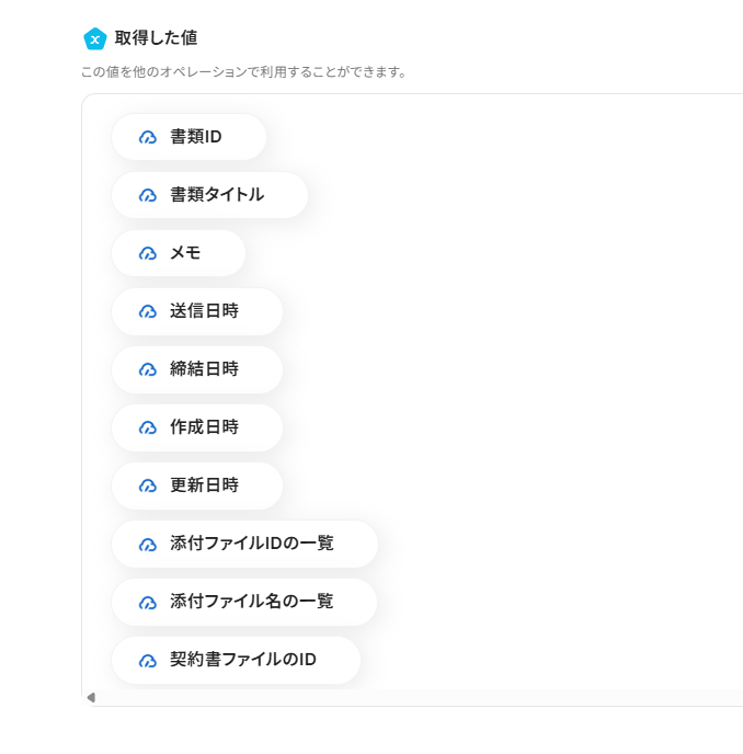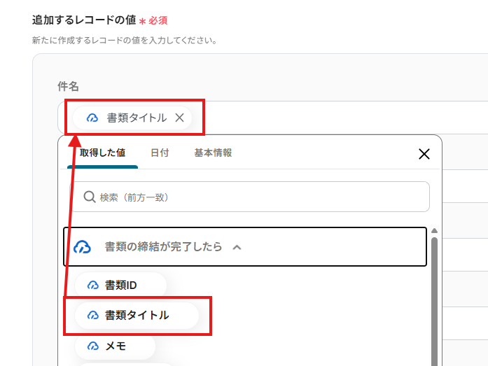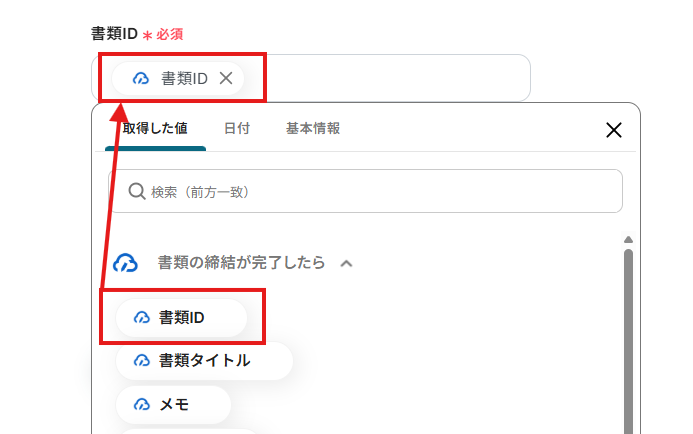 「書類ID」「ファイルID」は、入力欄をクリックして表示されるアウトプット(取得した値)から選択してください。