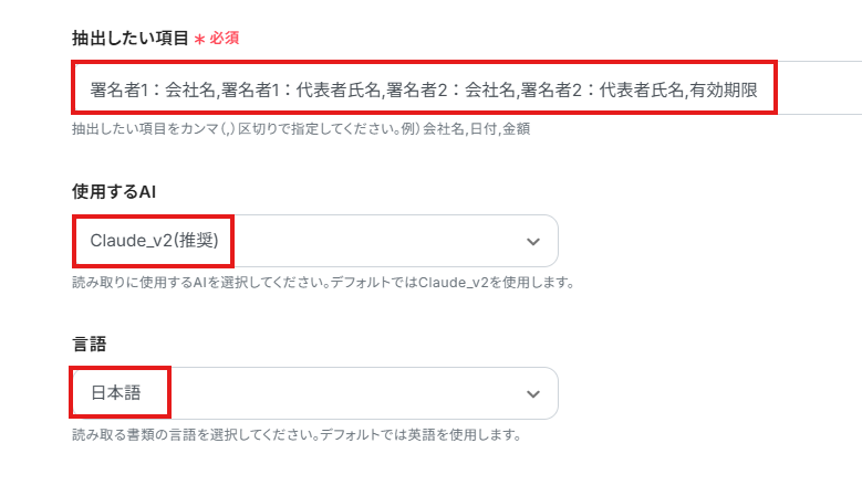 「使用するAI」は、読み取りに使用するAIを選択します。推奨されている「Claude_v2」がおすすめです!