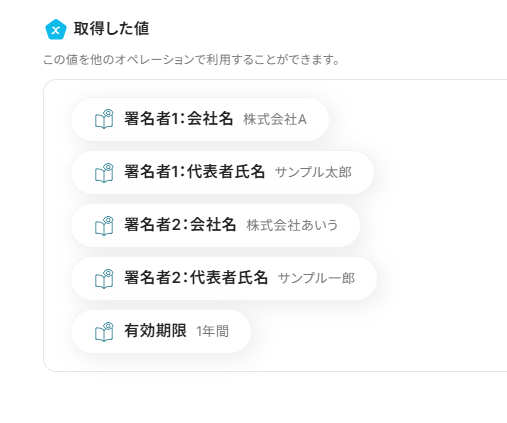 取得したアウトプットは、後続のオペレーション設定時の値としてご利用いただくことができ、フローボットを起動する度に、変動した値となります。