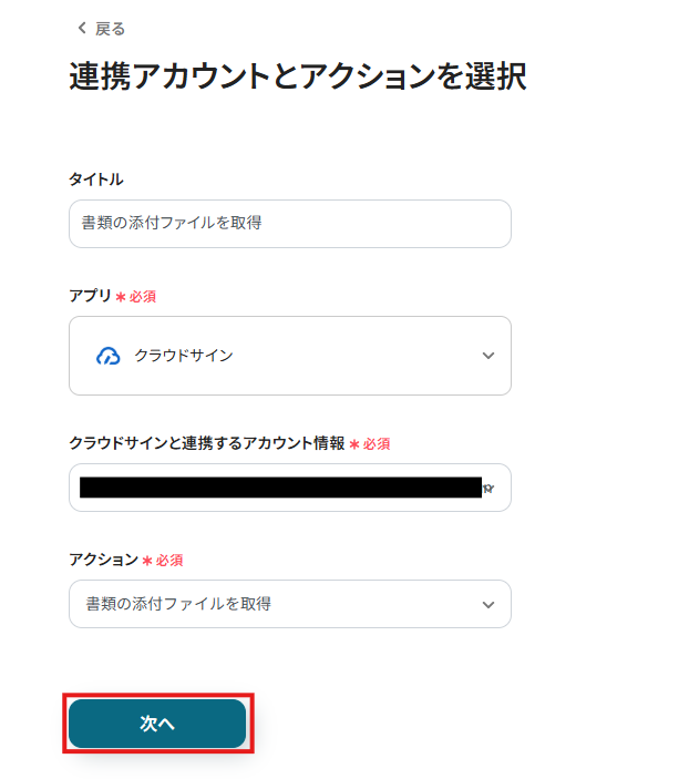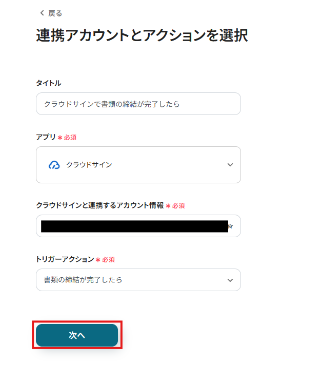連携するアカウント情報には、ステップ1で連携したアカウント情報が反映されています。トリガーアクションはそのままにして、「次へ」をクリックしてください。