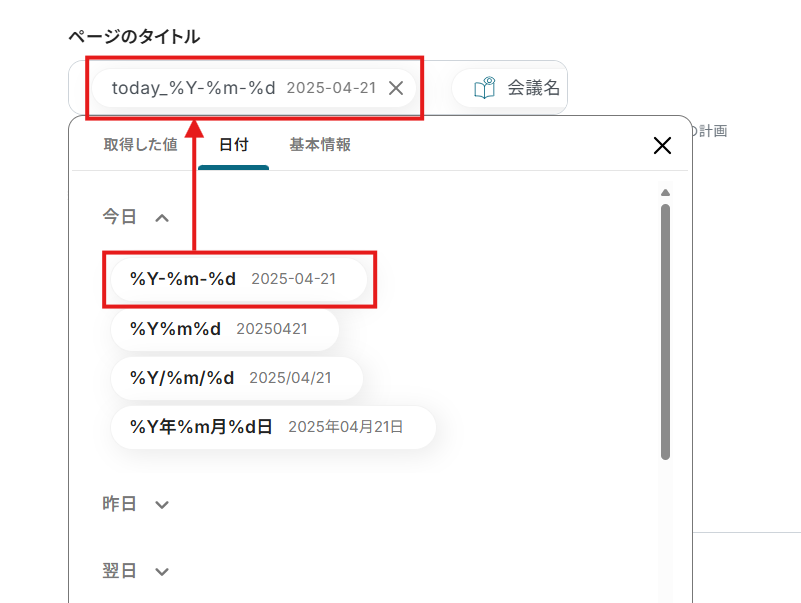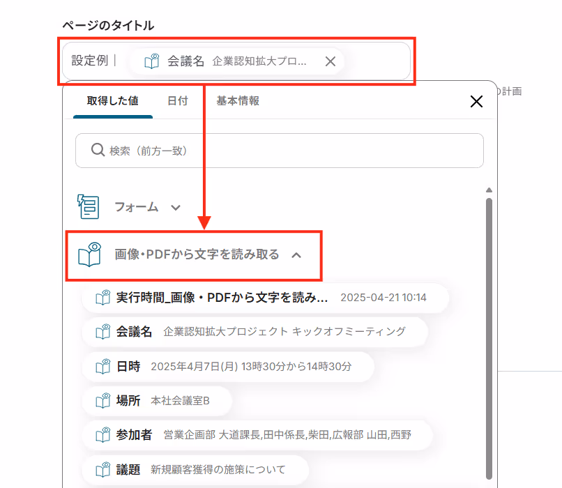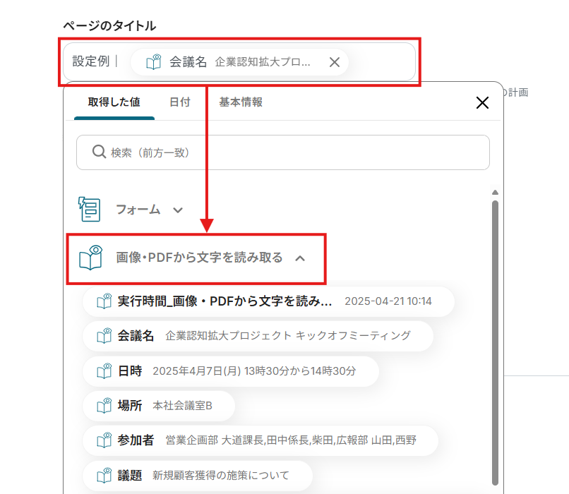 デフォルトでは{{会議名}}が設定されていますが、ファイルから取得した値に応じて自由に変更してください。