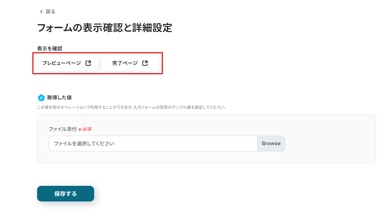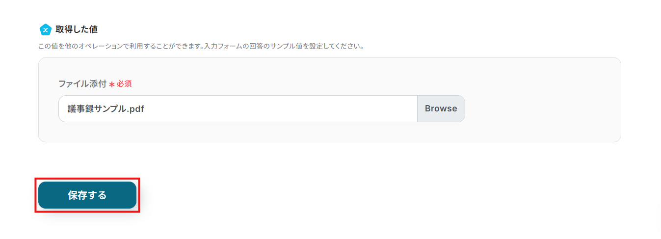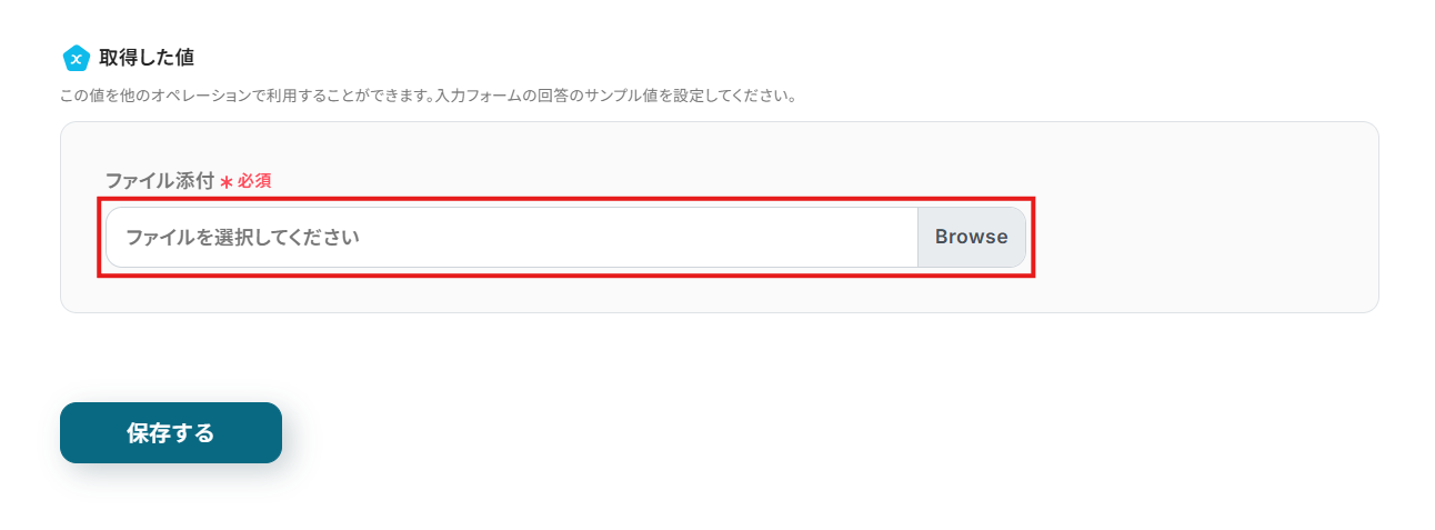 - 「ファイルの添付方法」にはデフォルトで、ステップ5で取得した「ファイル添付」が設定されています。