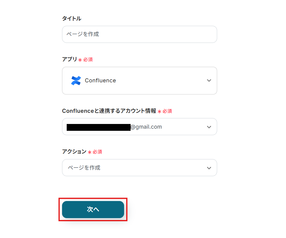 - 連携アカウントとアクションを確認し、「次へ」をクリック。