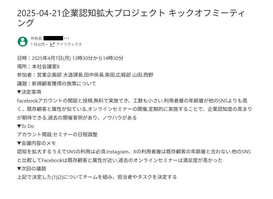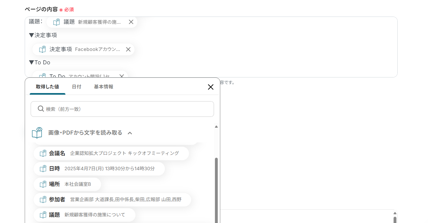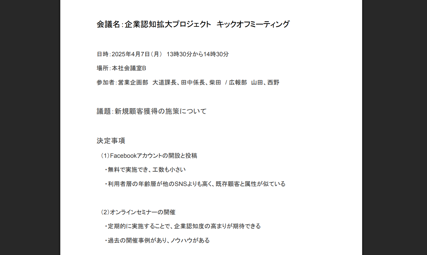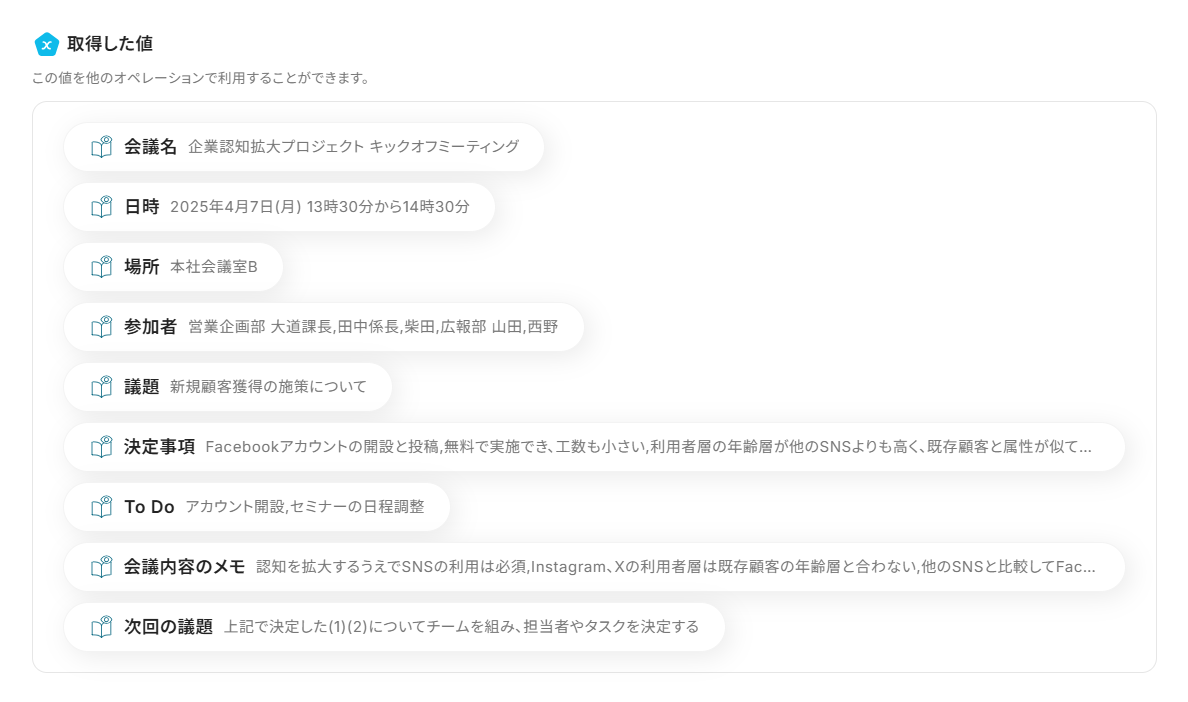 ここでは例として、デフォルトで設定されている「会議名・日時・場所・参加者・議題・決定事項・To Do・会議内容のメモ・次回の議題」を添付ファイルから抽出します。
