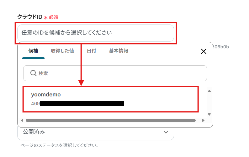 - 「クラウドID」の入力欄をクリックすると、連携しているConfluenceアカウントのクラウドから候補が表示されます。