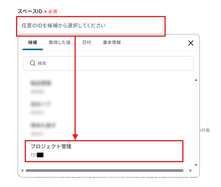 - 「スペースID」の入力欄をクリックすると、選択したクラウドから候補が表示されます。