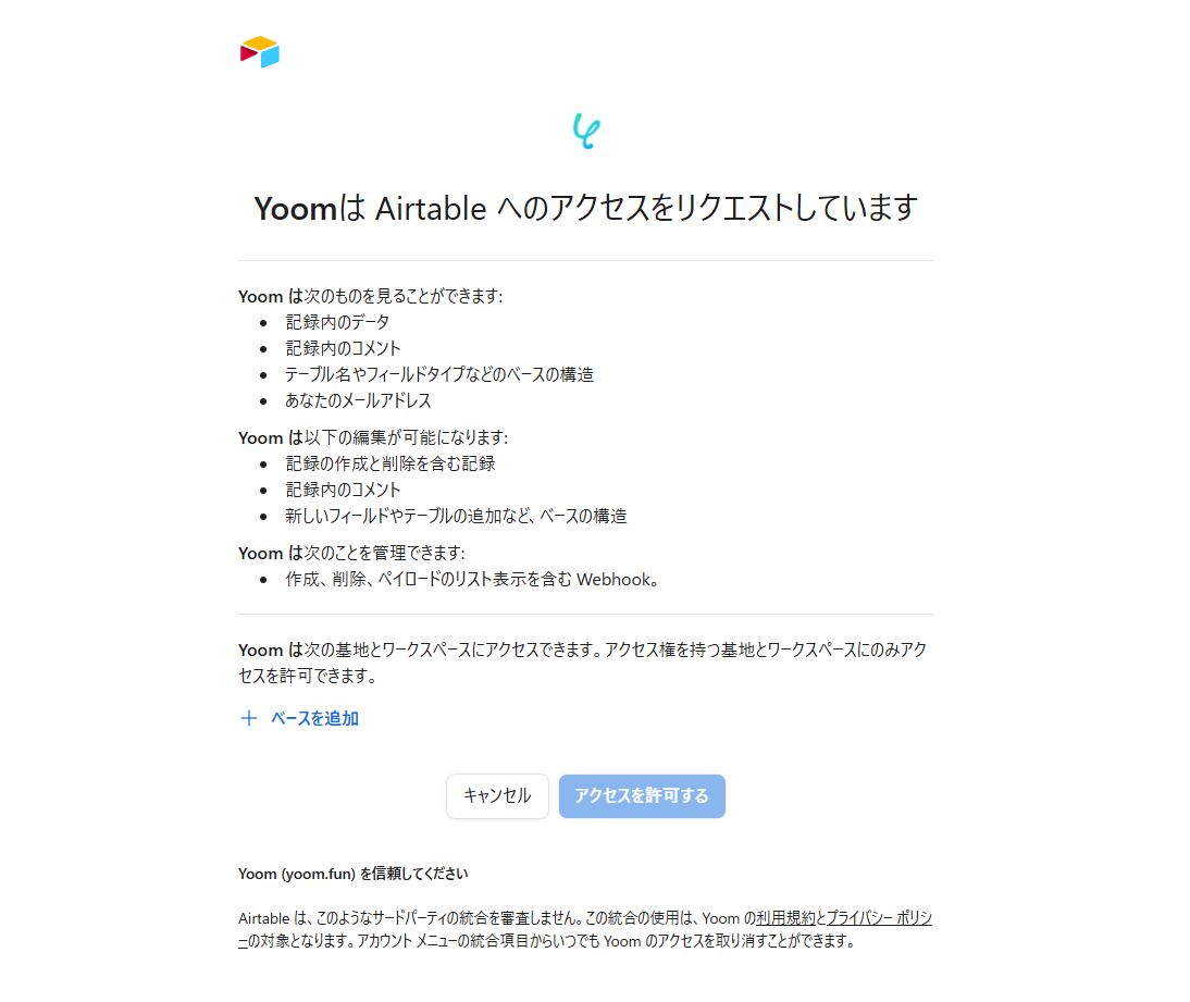 ベースの追加が完了したら「アクセスを許可する」を押します。