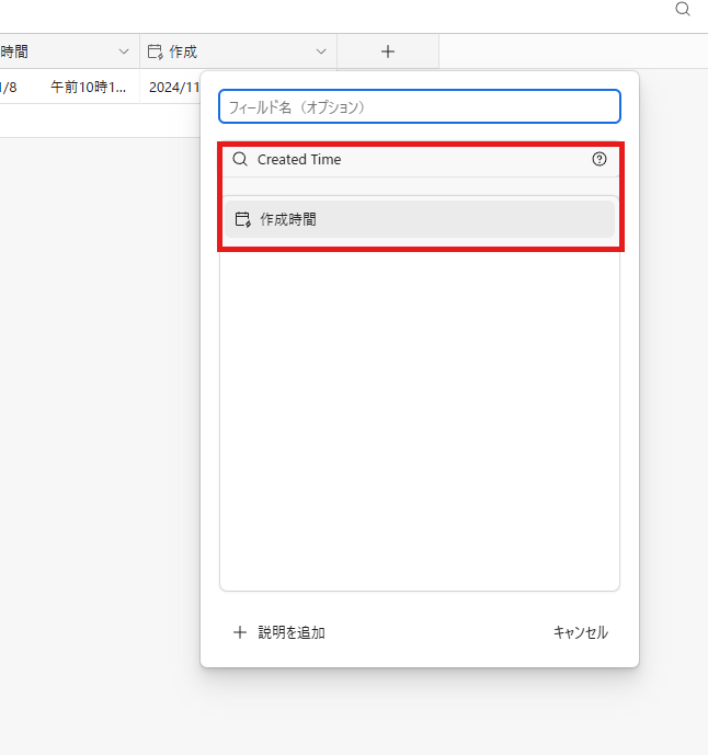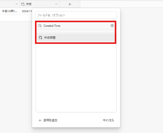 Created Time(作成時間)は、フィールドの検索から作成可能です。