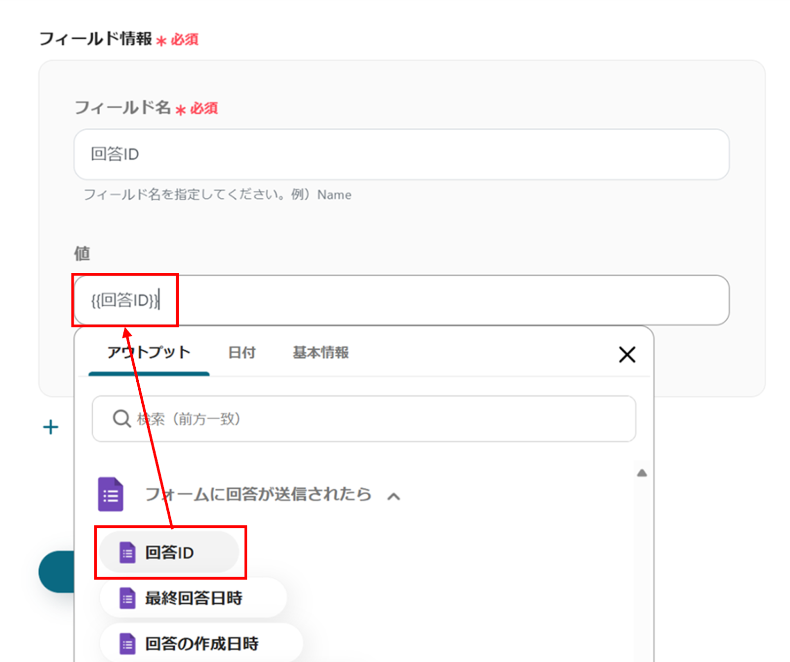 下へ進み、フィールド名、値を直接入力もしくはアウトプットから選択します。