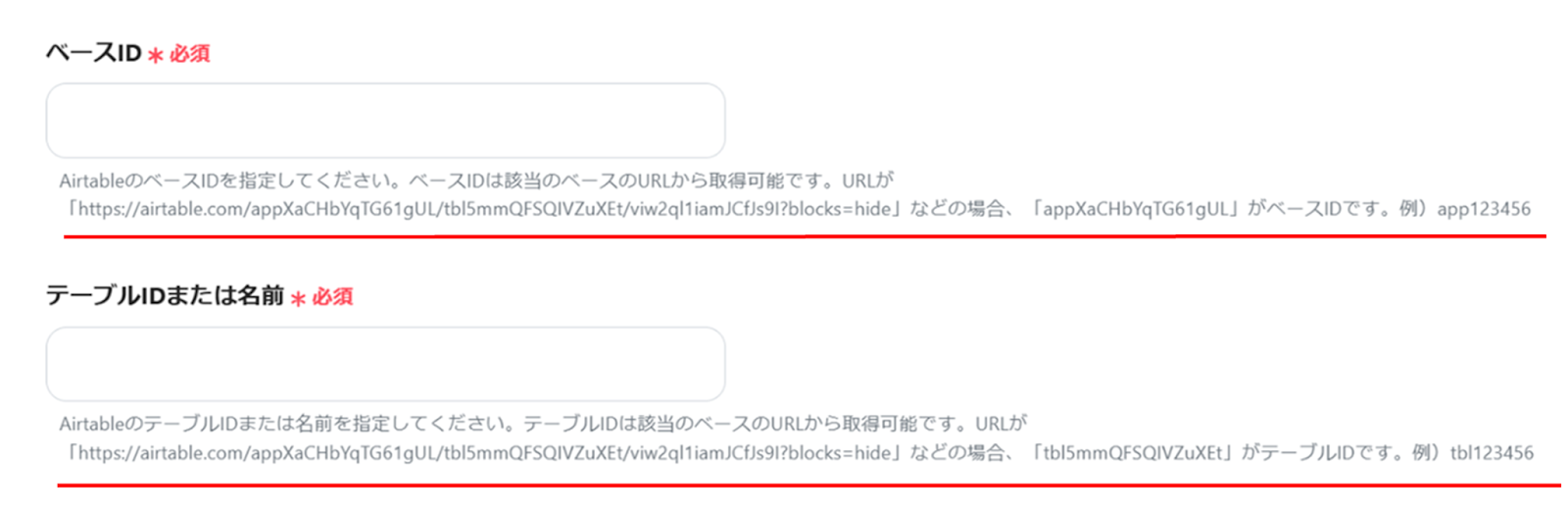 (3)「API接続設定」画面から、赤線を確認の上、ベースID、テーブルIDまたは名前を入力します。