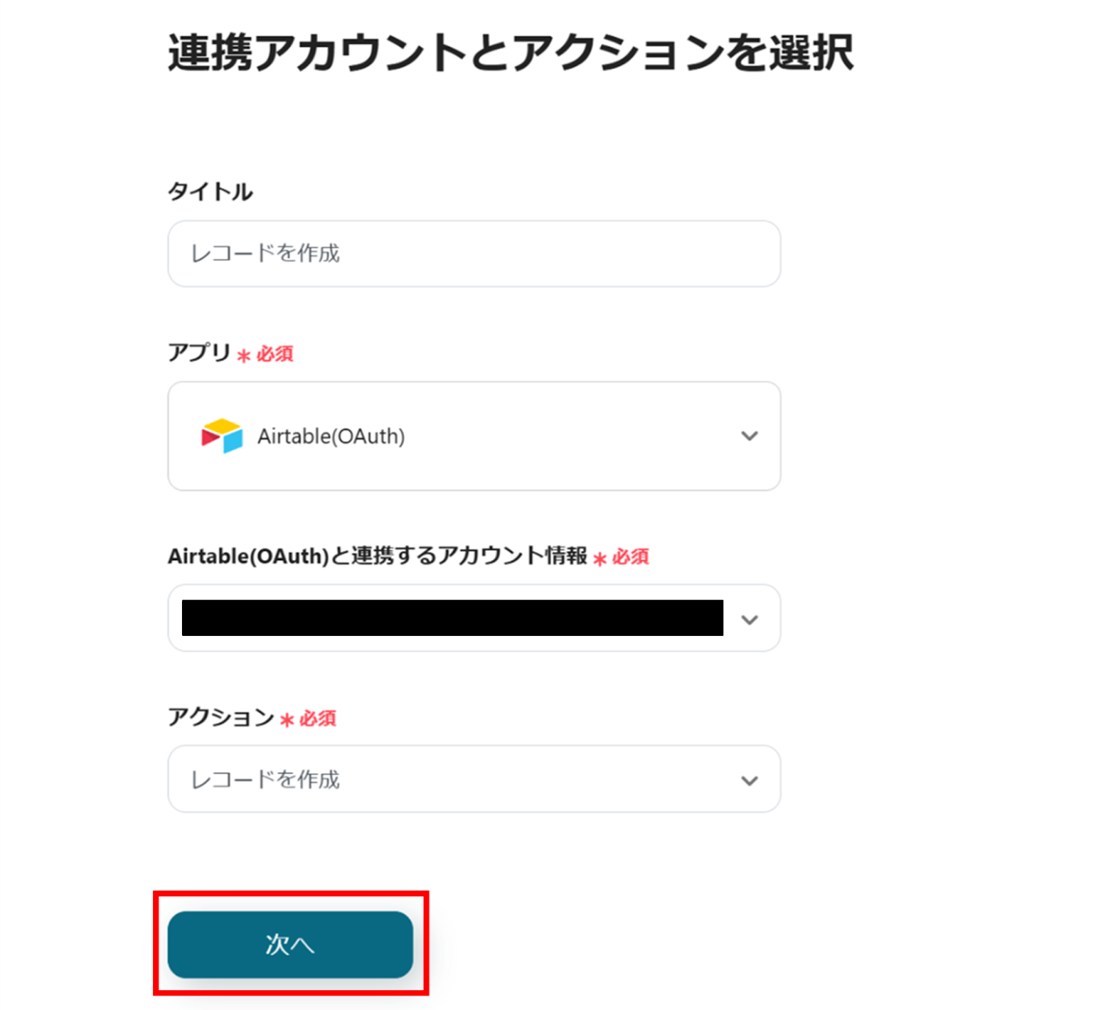 (2)Airtableの「連携アカウントとアクションを選択」画面から、Airtable(OAuth)と連携するアカウント情報に誤りがないかを確認し、アクションは「レコードを作成」のままで「次へ」をクリックします。
