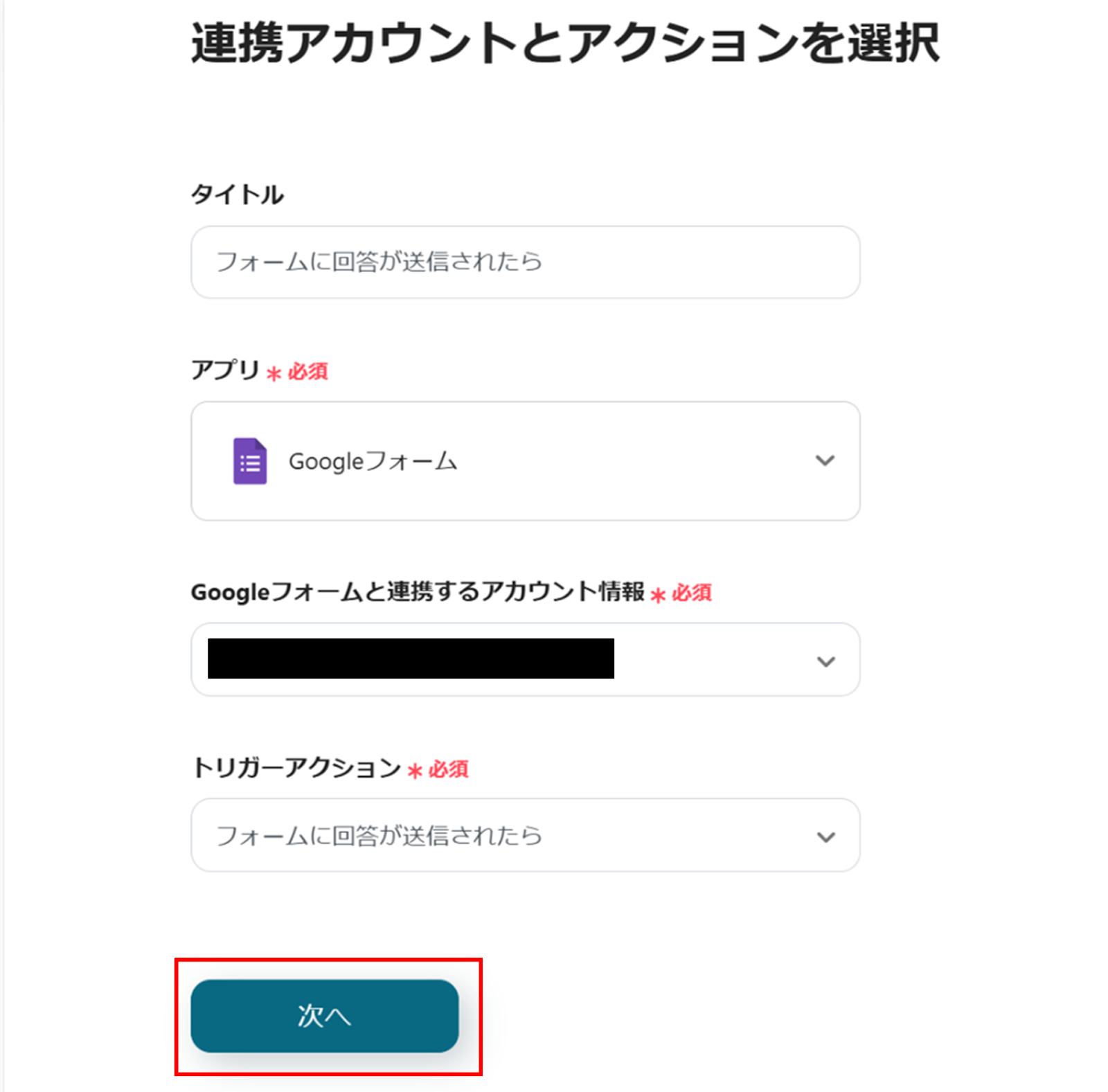 (2)Googleフォームの「連携アカウントとアクションを選択」画面から、Googleフォームと連携するアカウント情報に誤りがないかを確認し、トリガーアクションは「フォームに回答が送信されたら」のままで「次へ」をクリックします。