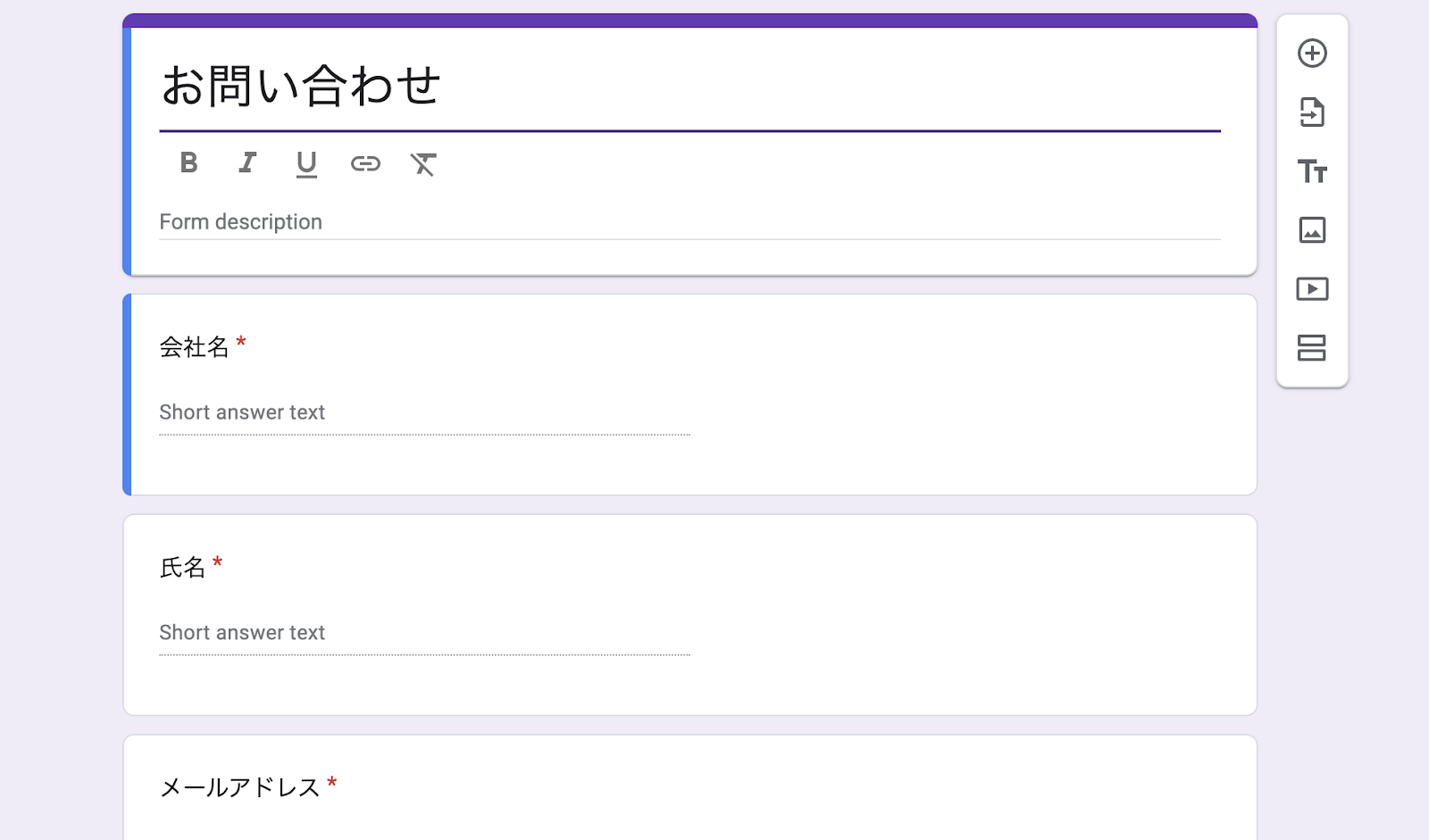 なお、今回は以下の画像のような回答フォームをGoogleフォームで事前に作成しています。