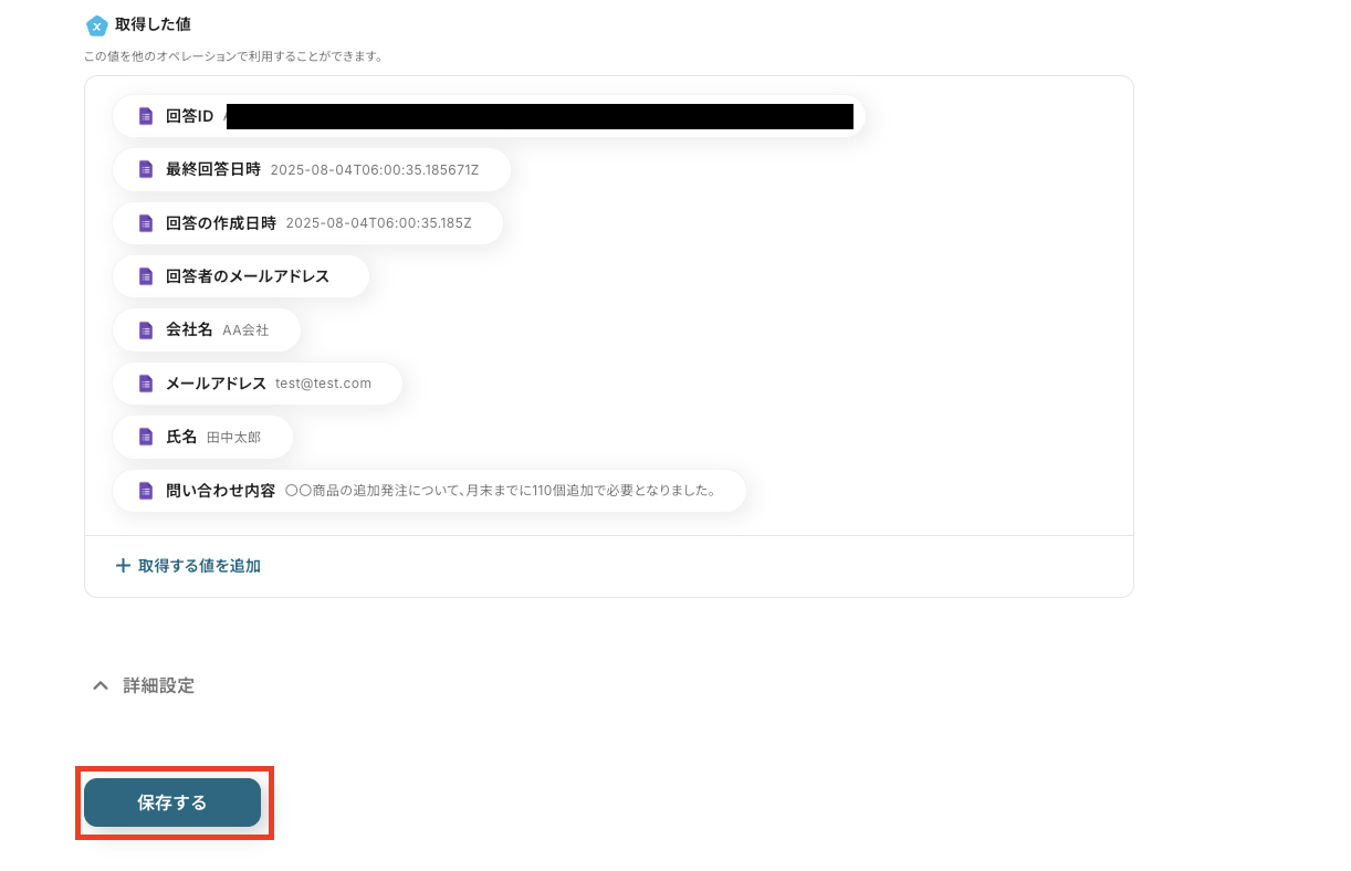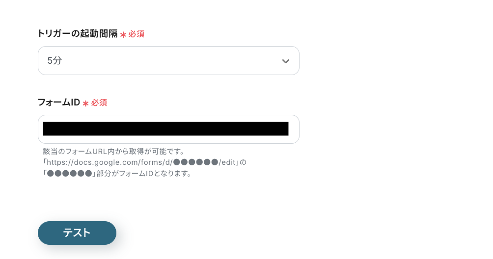 事前に作成したフォームにテスト回答を行っているので、項目設定後、[テスト]をクリックします。