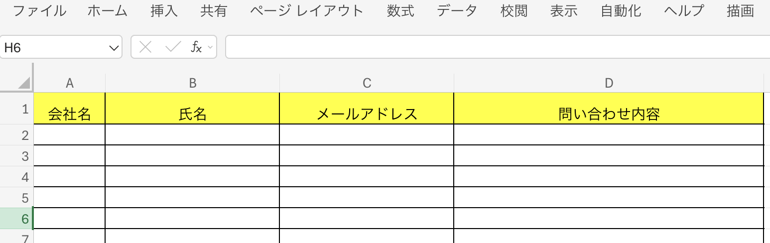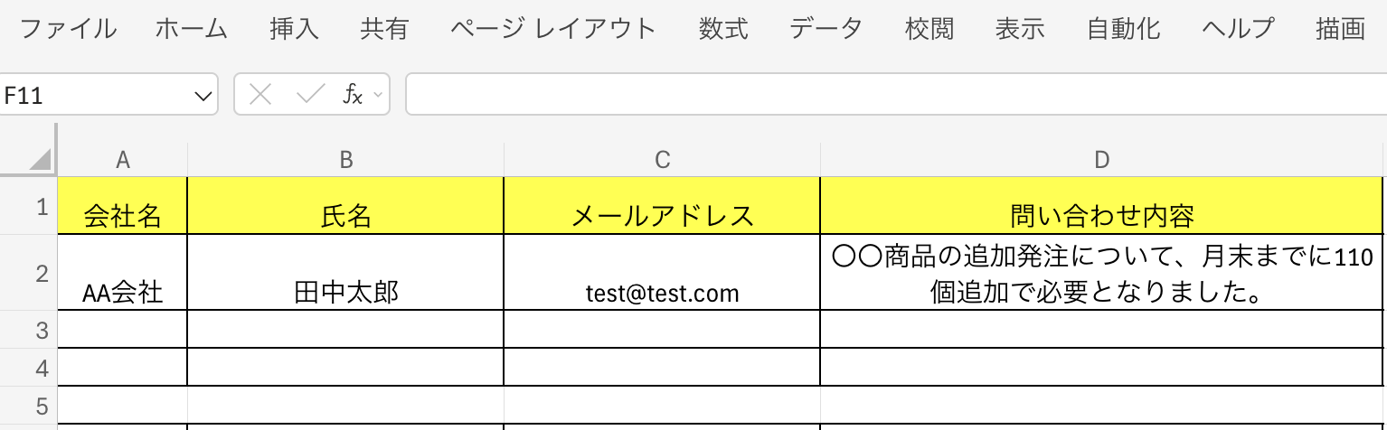 今回は、Microsoft Excel側で以下のようなシートを作成しています。