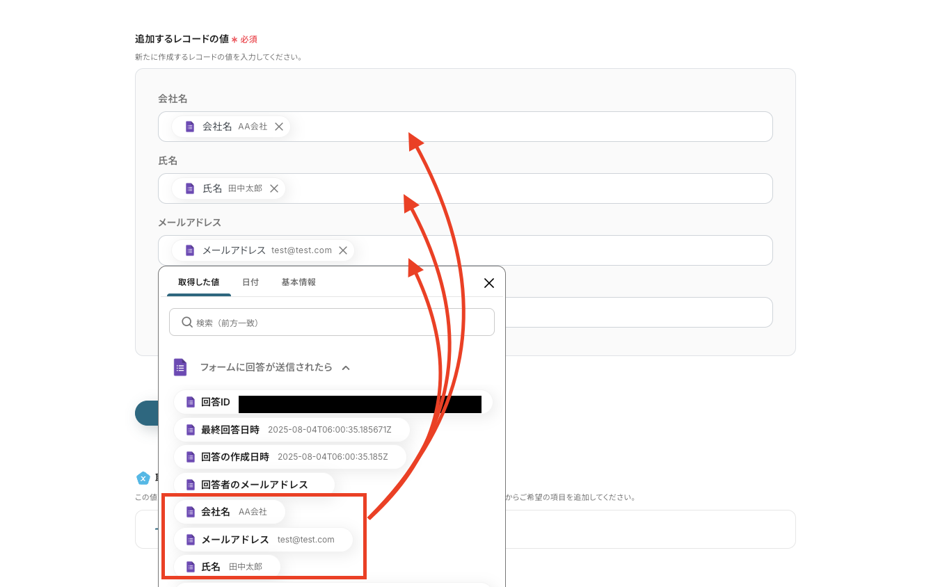 次の画面で、「追加するレコードの値」に情報を入力していきましょう。